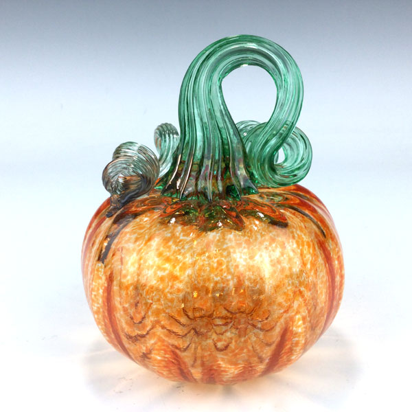 Orange Glass Pumpkin with Golden Iridized StemShort and sweet, there's an undeniable charm to this 5" diameter pumpkin. Recycled glass