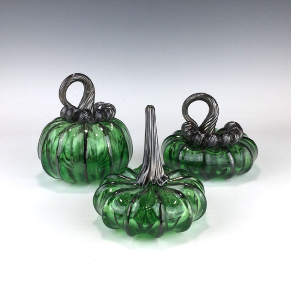 Cauldron Green Pumpkin Trio by WheatonArts. The "Cauldron Green Pumpkins" are beautiful, beguiling, & bewitching! Each pumpkin has its own