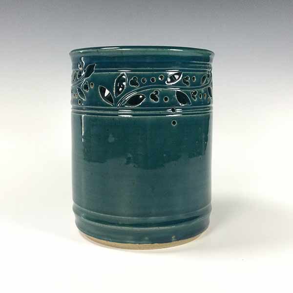 Phyllis Seidner Berry and Vine Household Crock in Deep Blue-GreenA wide band of cutwork berries and blooms on a leafy