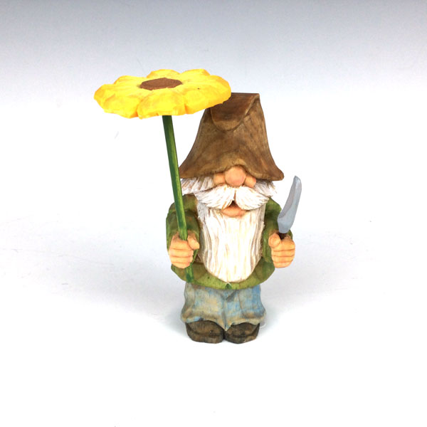 Seth the Gardner Gnome by Domenick Maggio.This hand carved wood Gnome named Seth is holding a lovely flower that he