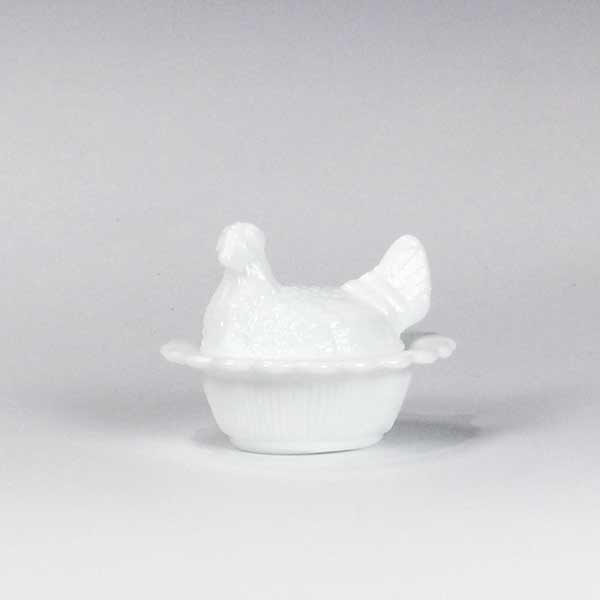 Mini Hen on Nest Basket in Milk Glass by Mosser Glass Small two piece hen will hold your tiny treasure.