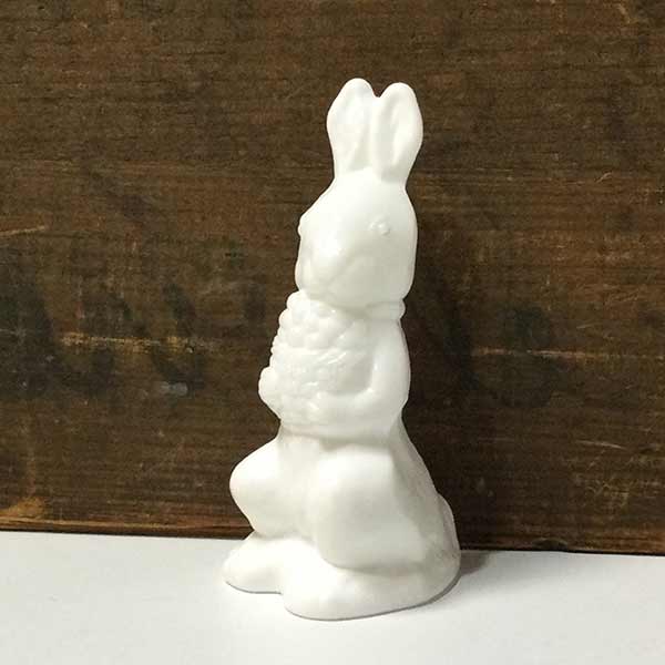Standing Rabbit with Basket in Milk Glass by Mosser Glass Classic Easter Bunny holding an egg filled basket stands 5"