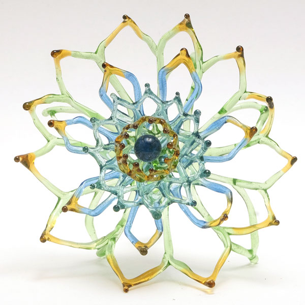 Padma Sculpture by Ivan Bestari Minar Pradipta. Flameworked recycled bottle glass sculpture. Comes in a Glass Dome for display. Measures