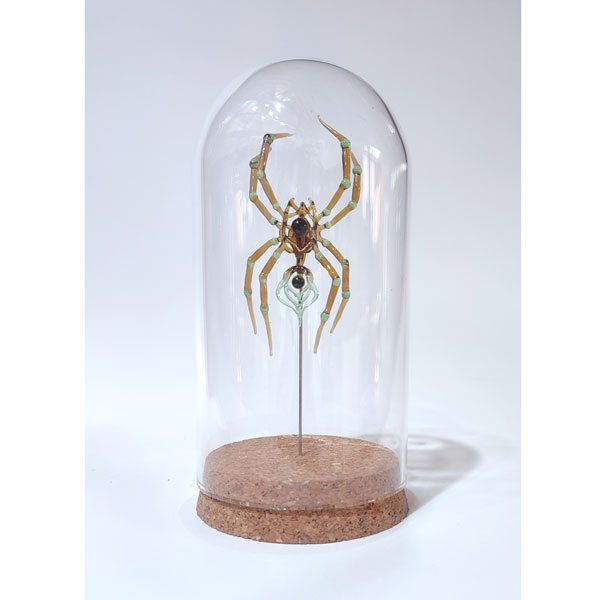 Spider Sculpture by Ivan Bestari Minar Pradipta. Flameworked recycled bottle glass sculpture. Comes in a Glass Dome for display. Measures