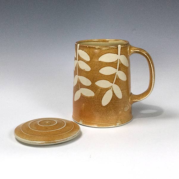 Samantha Bartlett Lidded Tall Mug with Wisteria Pattern6" tall, 4" rim diameter.Each mug is handmade and beautifully unique. There will