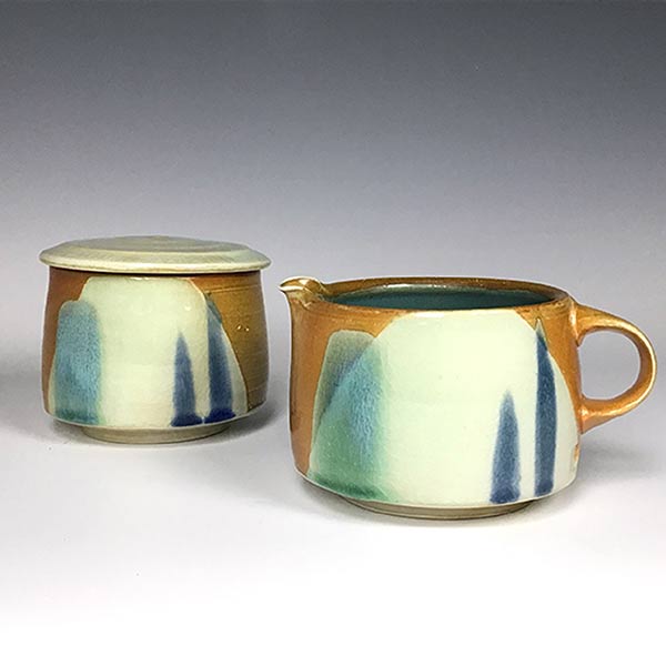 Samantha Bartlett Tri Color Sugar and Creamer SetCreamer: 3.25" tall. 4.25" rim diameter.Sugar: 3.75" tall with lid. 4.25" lid diameter.Samantha