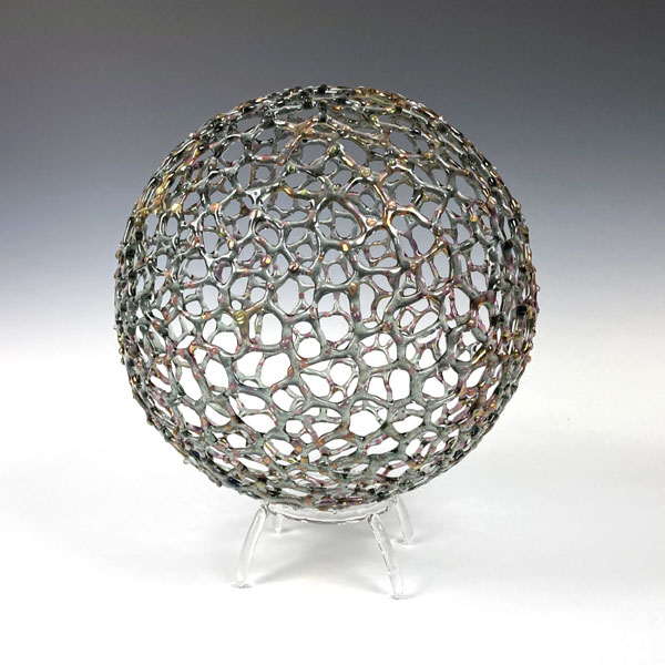 Gold and Gray Sphere by Bandhu Dunham. Lampworked Borosilicate Glass, Gold fuming. 2025. 11” diameter x 13” tall. About the
