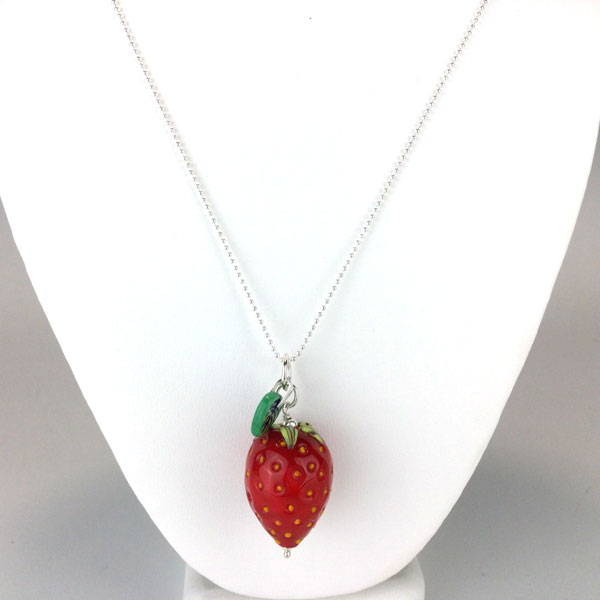 Strawberry Pendant on Chain by Lucie Kovarova-Weir. This flameworked glass strawberry looks delicious enough to eat. It is accented with