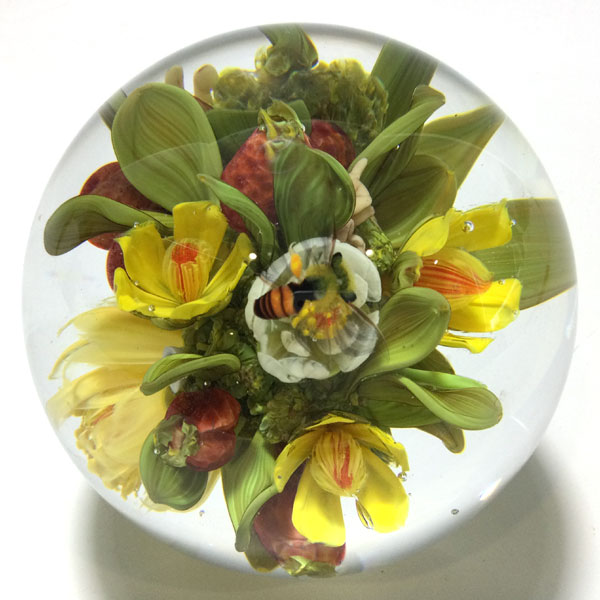 Yellow Blossoms with Fruit & Bee Orb by Paul Stankard. Yellow and White Blossoms with red fruit and green leaves.