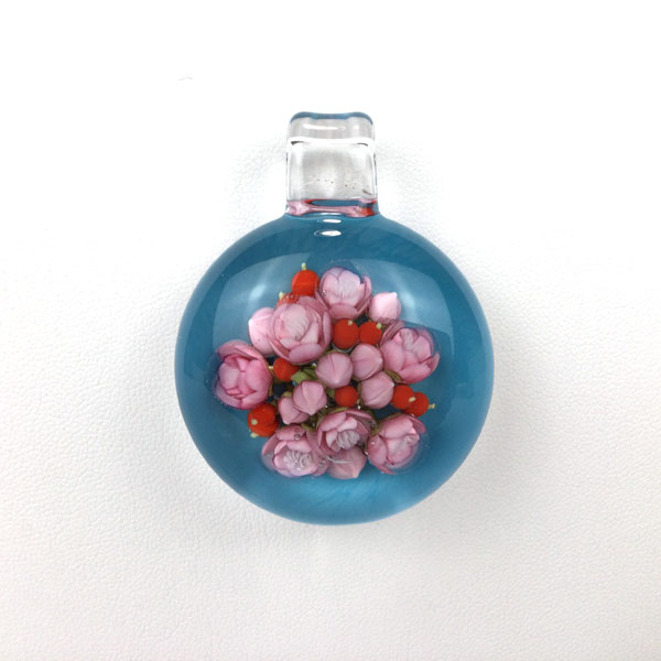 Pink Floral Bouquet Pendant by Clinton Smith. Pale pink flowers with red berries on a sky blue background. Signed and