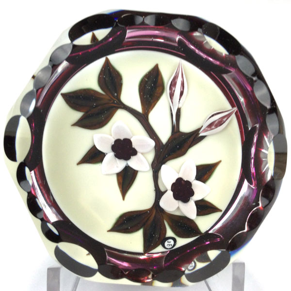 Faceted Bouquet on Cream/Ruby Paperweight by William Manson. Pale lavender flowers with buds and green stems sit atop a cream