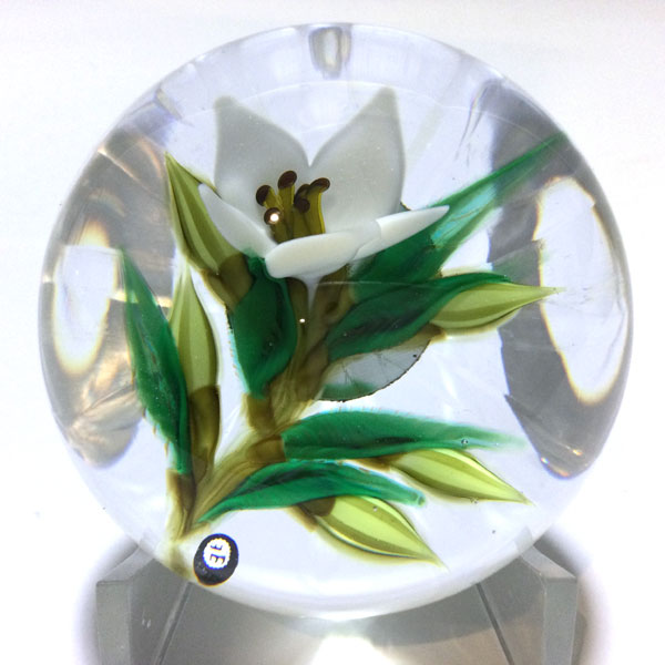 White Flower on Clear Paperweight by William Manson. A single white flower with buds sits atop a clear backgroud. Signature