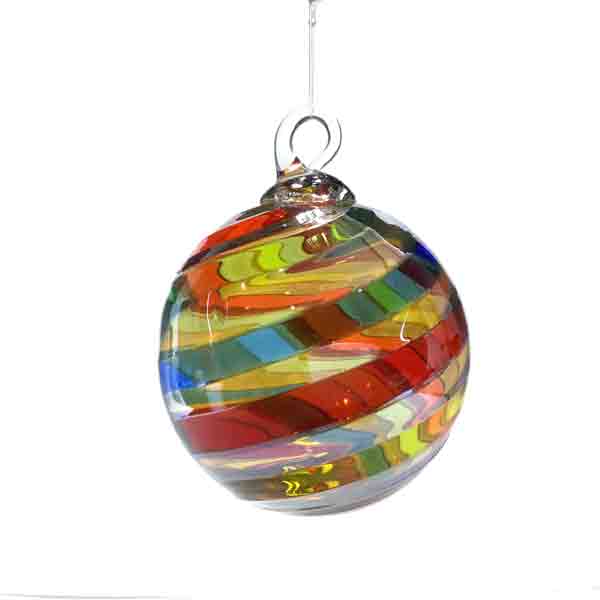 Rainbow Platinum Twist Round Ornamentby Glass Eye StudioPlatinum and colorful transparent glass combine in this round ornament.Blown glass.3" diameter. Handcrafted