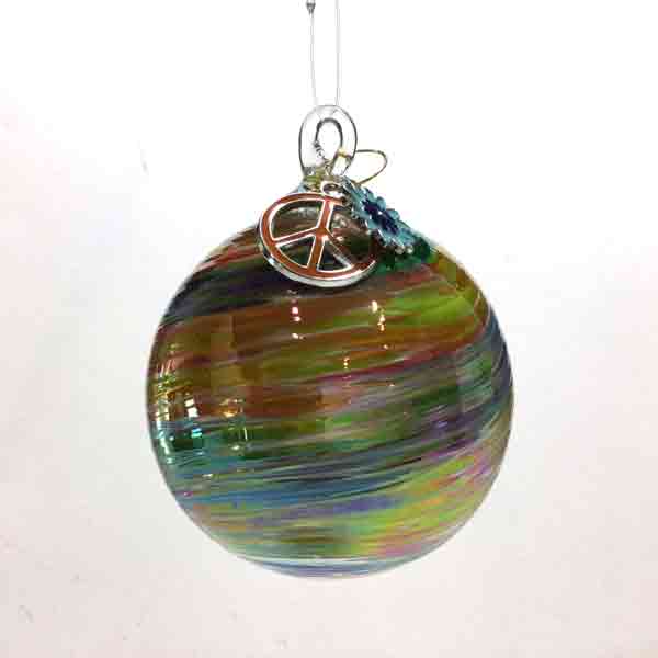 "Summer of Love" Glass Round Ornament. Accent with two metal charms, a Blue Daisy and an Orange Peace Sign.by Glass