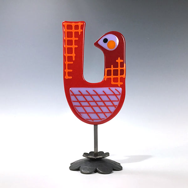 Fused Glass Red Partridge with Lavender Accents on Steel Florette Base by Diana Juratovac of Agape Fused Glass Crafted impeccably,