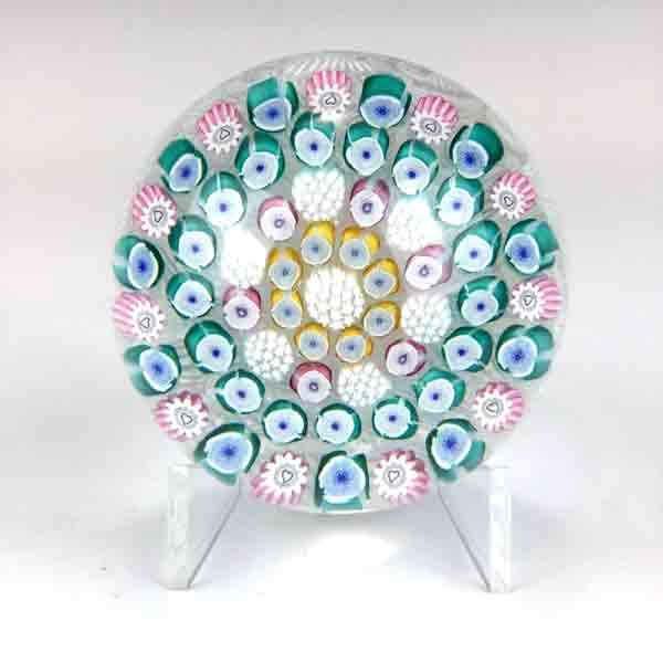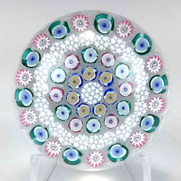 Large Concentric Roses & Stardust Paperweight by John Deacons. This design is made up of concentric circles comprised of rose