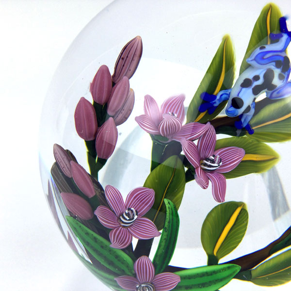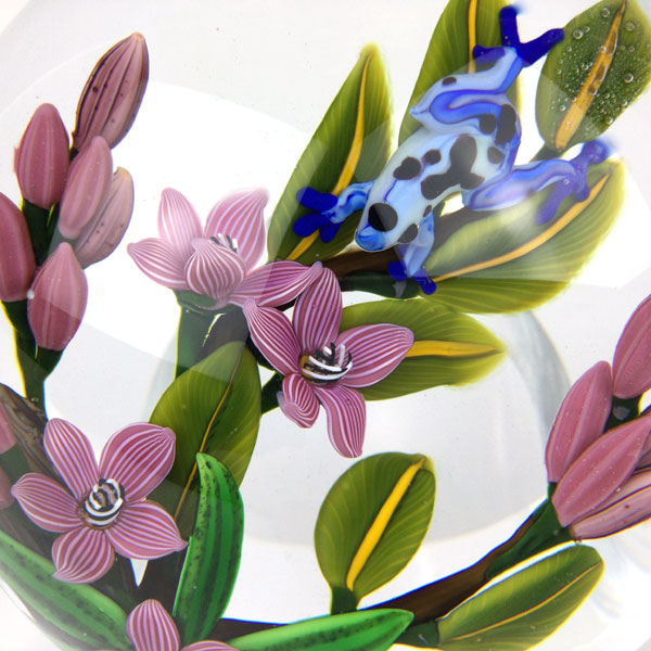 A Prince Unkissed Poison Frog Paperweight by Colin Richardson. Flameworked glass Blue Poison Dart Frog with Lavendar Flowers on a branch with varigated green leaves. 3″ diameter. Signed and dated 2022. Gift boxed with artist card.