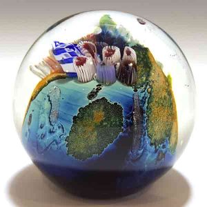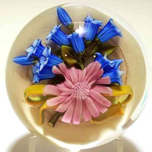 “In my lampworked paperweights I strive to transform the ephemeral into the eternal, capturing a bloom that may last for only a day or a butterfly that may live for only a week. I am intrigued by botanical forms, and by the incredible variety of colors, shapes, and textures in plant life. As I have begun creating my own designs for vacuum-encased paperweights I've turned to flowers and fruit for inspiration.