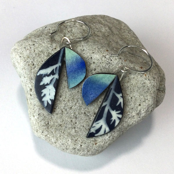 I merge my love of nature with my love of design to create this jewelry. I select leaves, stems, and petals from native plants to arrange atop specially treated paper, then expose them to the Arizona sunlight to produce the one of a kind photograms that form the basis of my jewelry’s distinctive blue and white botanical designs. Each turns out completely different depending on place, plant, season, and time of day, and it’s always a delight to see the image emerge.