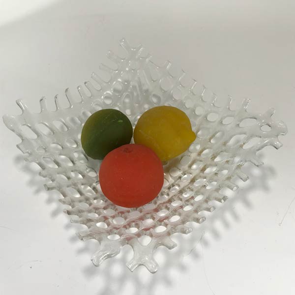 “Basket of Citrus Fruit” by Lucartha Kohler. Fused clear glass woven bowl with a cast glass lemon, lime and orange.