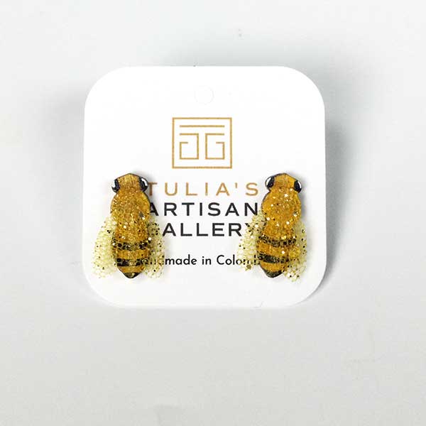 Natural dried gourds are crafted into vibrant, handpainted jewelry by a team of indigenous Mokana artisans. Painted bumblebees are adorned with shimmery golden fabric accent wings – a combination of traditional knowledge and contemporary skill, handmade in Columbia. 1″ long earrings are lightweight and feature stainless steel posts.