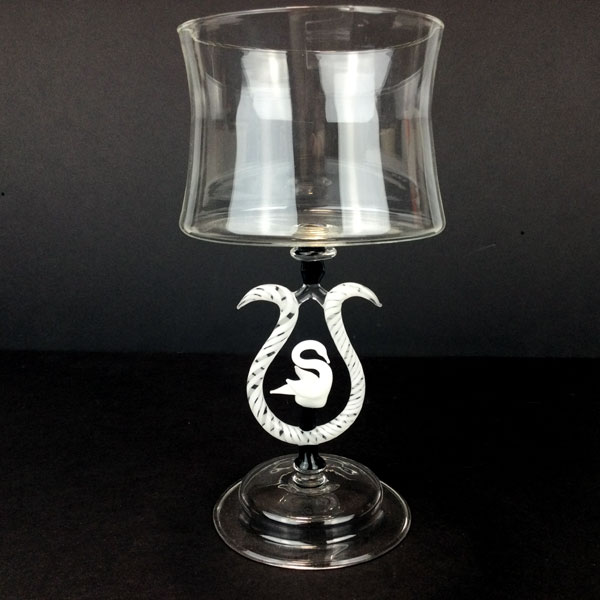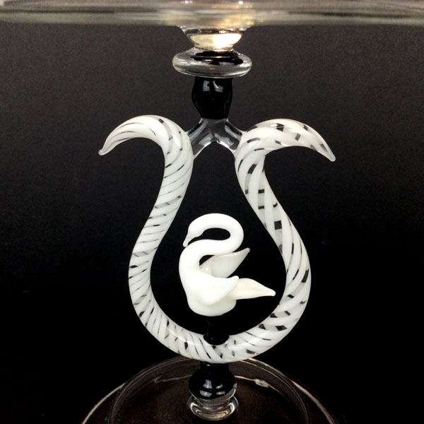 Black & White Swan Goblet by Jason Gordon. This flameworked goblet was made by Jason Gordon, a WheatonArts Volunteer Artist. The delicate white swan sits inside the twisted cane looped stem. It is signed and comes with an artist card. It measures 8″ h x 4″ diameter.