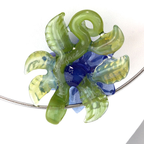 Blue Botanical Pendant on Omega Wire by Lacey “LaceFace” Walton. Flameworked glass Flower Pendant on an Omega Wire. A double layer flower with an opal in the center surrounded by spring greem leaves. The pendant measures 2″ l x 2.5″ w. The wire choker measures 12″ to 14″.