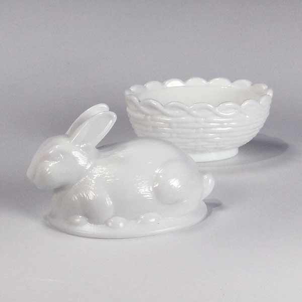 This two-piece bunny on basket set in matte white glass is ideal filled with candy or a special trinket.