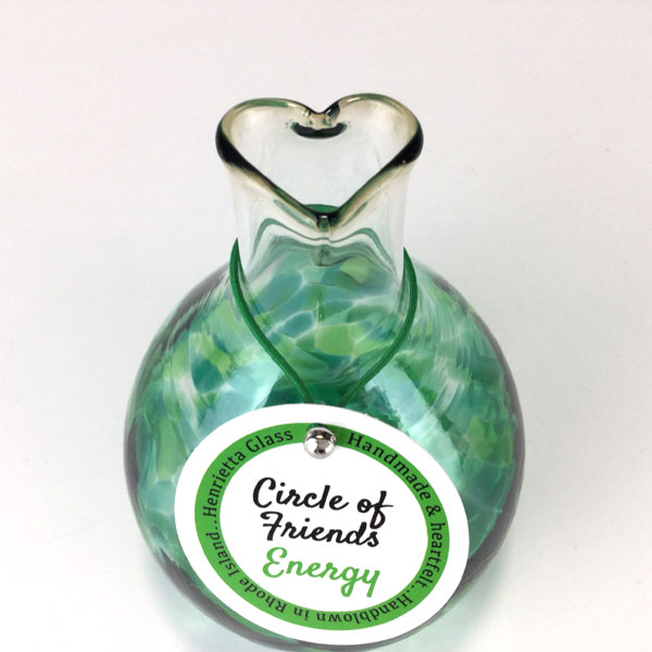 Circle of Friends “Energy” Vase by Henrietta Glass. The top of the vase is in the shape of a heart. Each vase comes with a hand tag specific to its trait/color on a color coordinated satin ribbon and is packed in a gift box. Size: Approximately 4.5 inches tall, 3 inches in diameter.