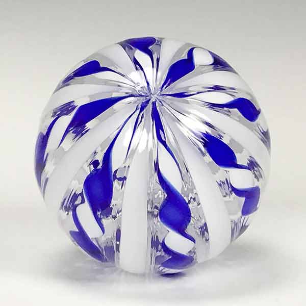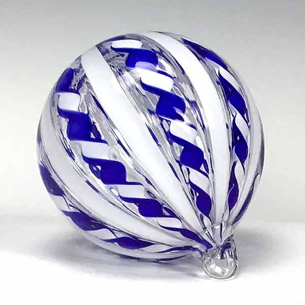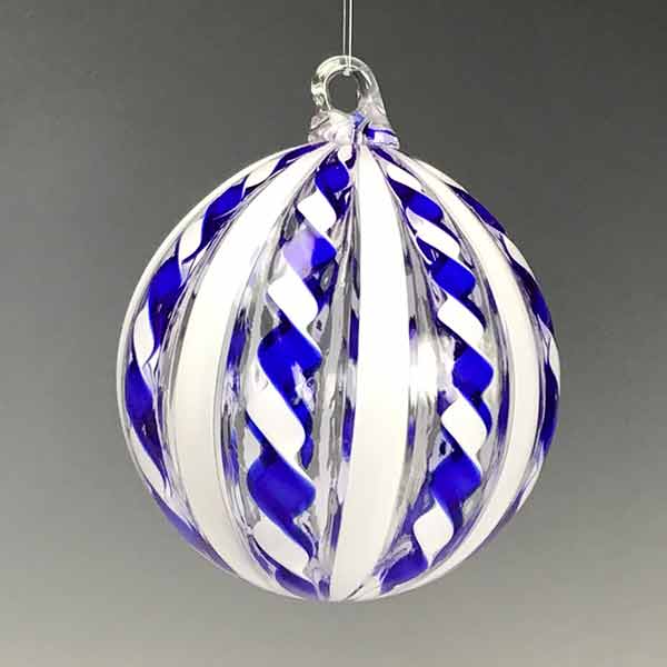 A swirl of cobalt blue twirls next to strands of white in this beautiful glass cane ornament. Clear glass accents the movement. Each step of the glassmaking proces is performed by the artists with a combination of expertise and experience. The ornament measures 3.75″ in diameter and features a glass loop.