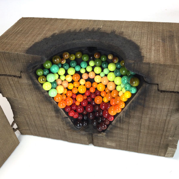 Contrast by Floor Kaspers. This sculpture features an vintage Venetian Glass Mold with colorful glass pins on one side a white porcelain pins on the other. The mold is 7″ x 6″ x 6″ when closed, but when opened up it is 12″ wide.