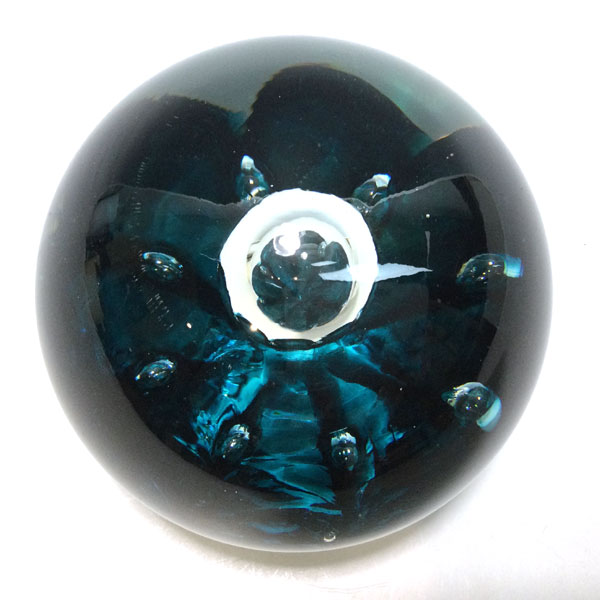 This paperweight uses an optical mold to create the uniform bubble pattern. Handcrafted in WheatonArts. Stamped on bottom the bottom with our logo. It measures approximately 3″ in Diameter.