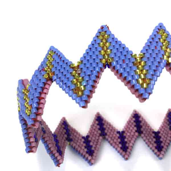 Up and Down Reversible Beaded Bracelet by Davala Designs. This bracelet is handmade using a technique called “beadweaving” usings tiny glass beads. One side is Mauve and Cobalt Blue. The other side is Perwinkle and Gold. It measures approximately 7.5″. Slides on.