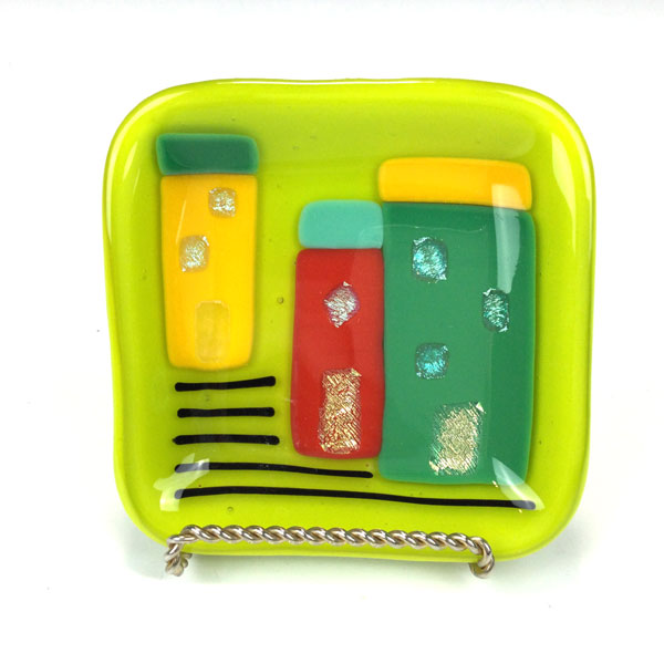 Lime Fused Glass Building Trinket Tray by Deb DiMarco. This fused glass tray can be used for jewelry, change, keys or for a charcuterie dish. After vacationing in Greece Deb was inspired by the colorful buildings along the coast. It measures approximately 4.25″ x 4.25″.