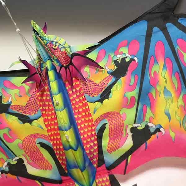 Majestic, neon colored dragon kite; includes nylon storage case and handle with string. Minimal assembly required.