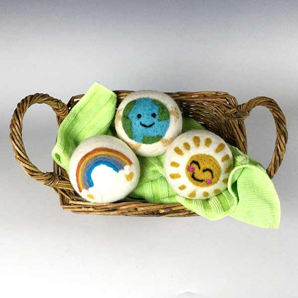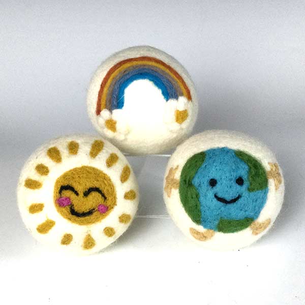 Introduce a synthetic-free, natural fabric softener to your laundry routine with our Earth Love Three Piece Wool Dryer Ball Set. Each 3″ dryer ball is made with 100% natural New Zealand wool. Guaranteed Fair Trade, dryer balls are hand-felted in Nepal. Three designs feature a smiling earth, a floral rainbow and a beaming sun. Lasting for over 1000 loads, you'll save while decreasing drying time.