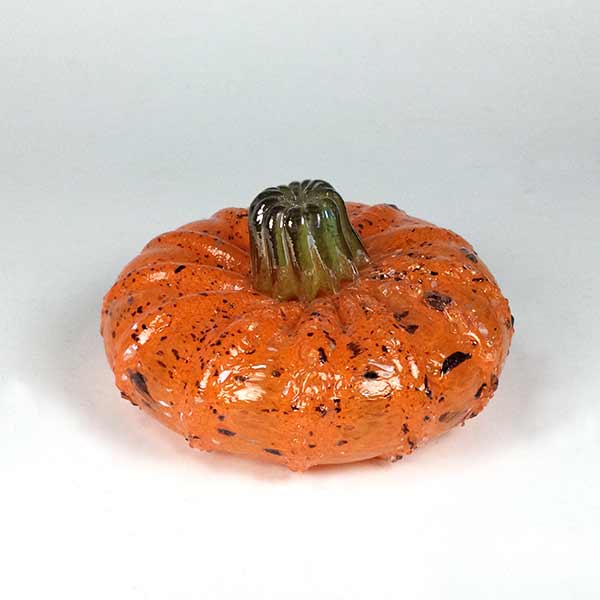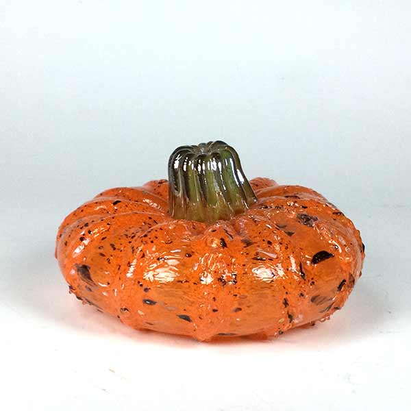 Short and sweet, there's an undeniable charm to this 5″ diameter pumpkin. Recycled glass cullet provides a texture that draws interest. Its golden iridized stem adds a gleam to the 3″ height. Each beautifully unique pumpkin is hand-shaped in the WheatonArts Glass Studio by our talented team of resident artists. Completed pumpkins are etched “WACC” for Wheaton Arts and Cultural Center.