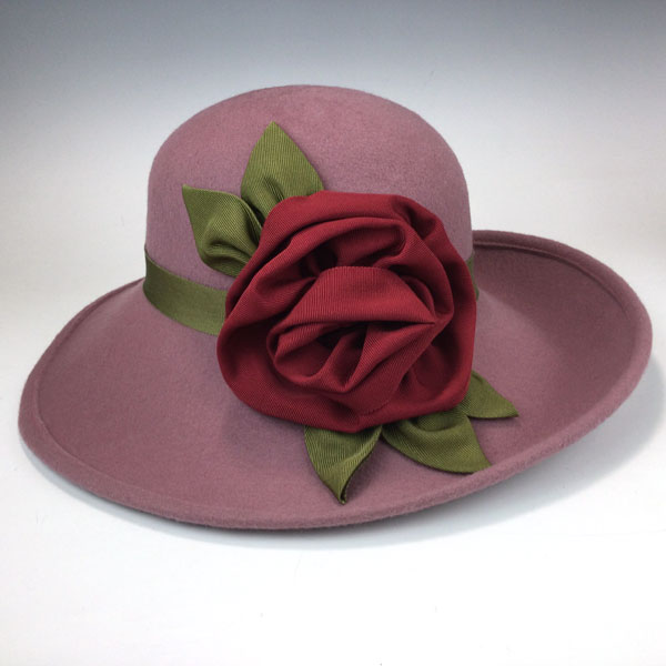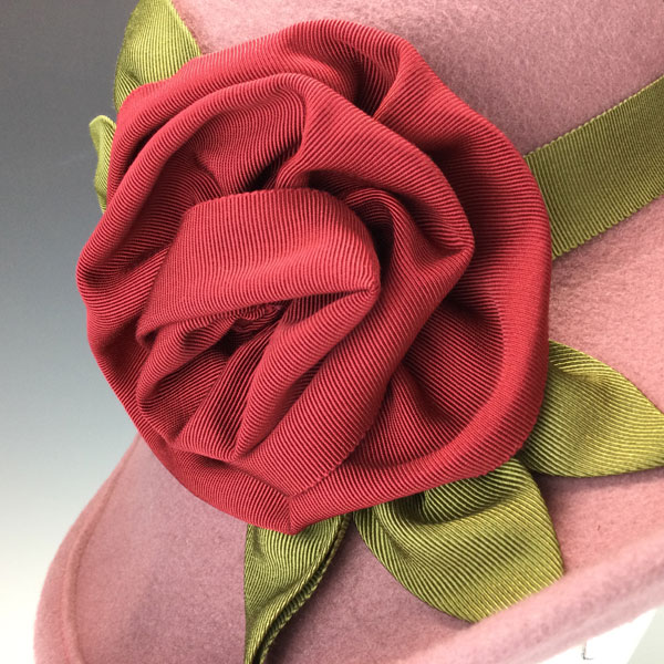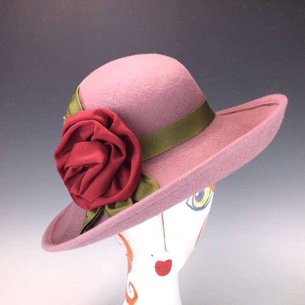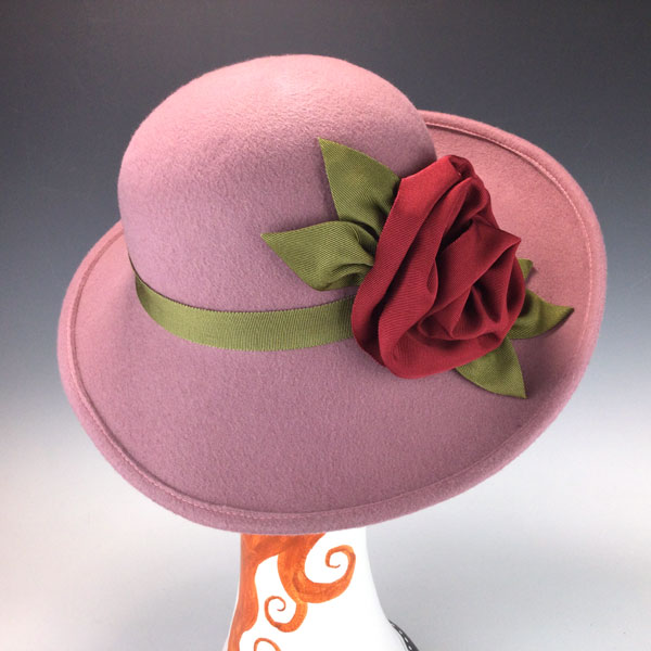 Grosgrain Rose Cloche Hat with Burgundy Rose by Kathy Jeane Millinery. Rose Wool Hat with Burgundy Grosgrain Ribbon Rose Accent. Hand Made in Fairfield, NJ. 100% Woolfelt. Spot Clean only.
