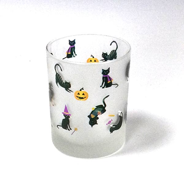 Mischievous kitties get into the candy, pose by a pumpkin, and frolic about a frosted 14 oz double old fashioned with a solid 1.25″ base. The design is as visible and detailed from the inside of the glass as from the outside – must be magic!