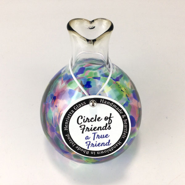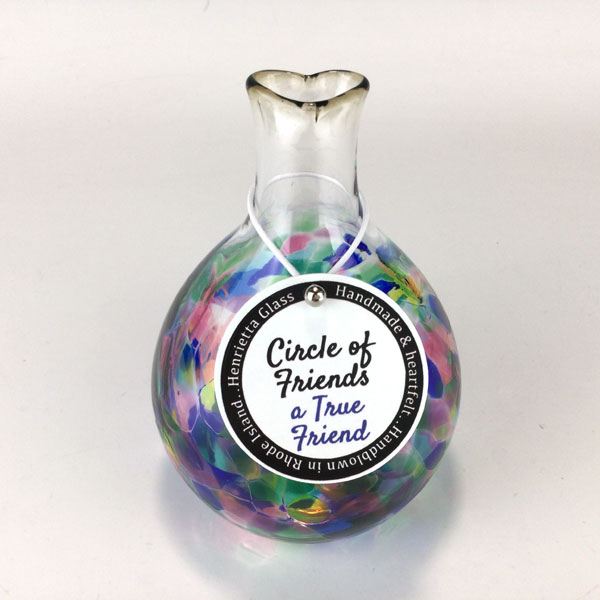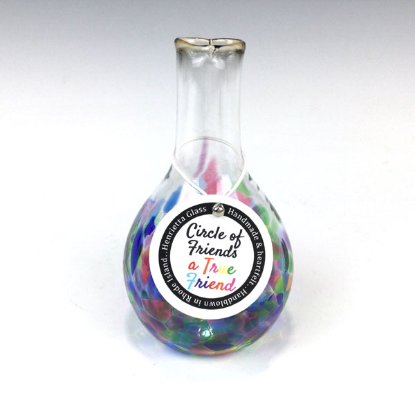 Circle of Friends Vase “True Friend” by Henrietta Glass. Each vase comes with a hand tag specific to its trait/color on a color coordinated satin ribbon and is packed in a gift box. Size: Approximately 4.5 inches tall, 3 inches in diameter.