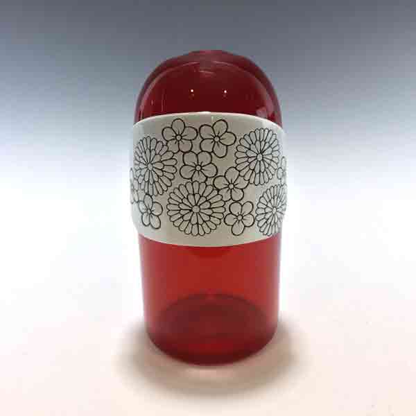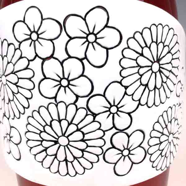 KIKU #1 by Ayako Ikeda. Red Vessel with White Panel of Flowers on the Front. Measures Approx. 9″ w x 6″d x 6″h KIKU means Chrysanthemum in Japanese