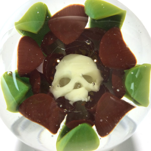 Life & Death Red Flower Ball by Rocko Belloaso. A white skull is hiddened inside a red flower. “Momento Mori” is a latin phrase meaning “Remember that you have to die”. Flameworked borosilcate glass. Signed and dated 2024. Measures approximately 2″ diameter.