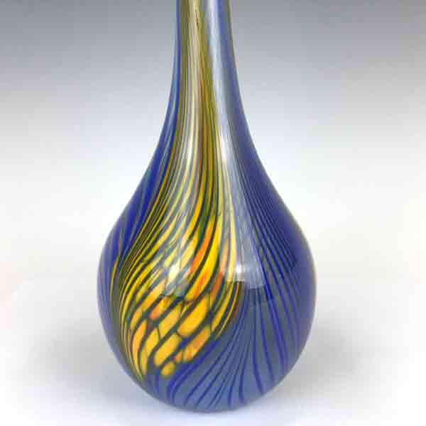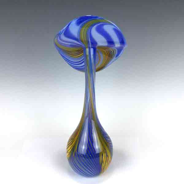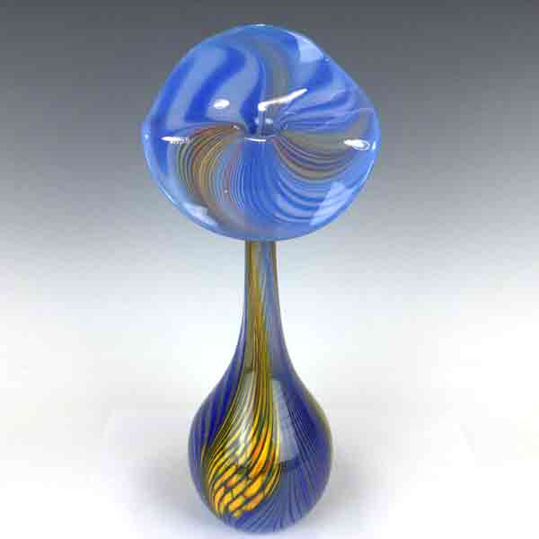 Jack in the Pulpit vase in a treaded design in shades of light blue, yellow and orange. Measures approximately 5″ wide x 11.75″ high.