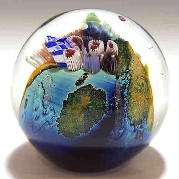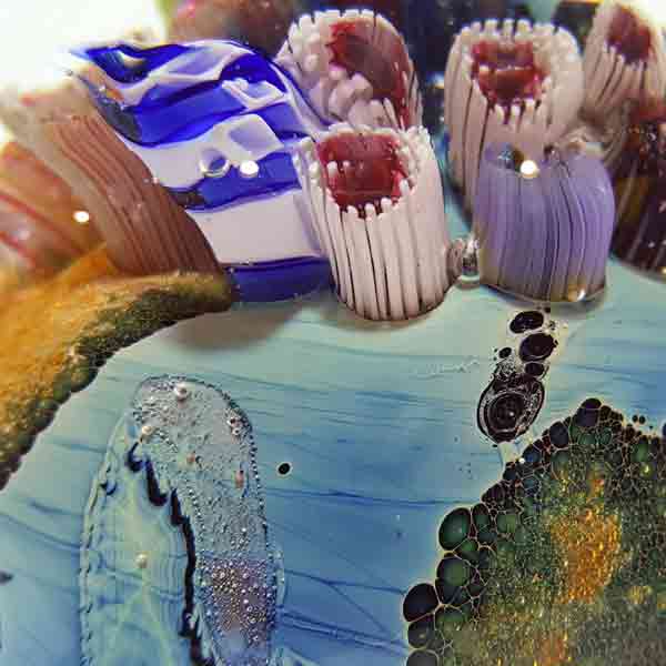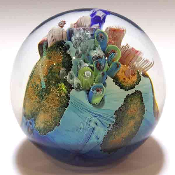 While he has been successful creating unique goblets, vases and bowls, perhaps his greatest satisfaction is derived from his planets: luminous glass spheres encasing kaleidoscopic landscapes, underwater scenes and vistas of outer space that reflect the Earth and the vastness and complexity of the universe.
