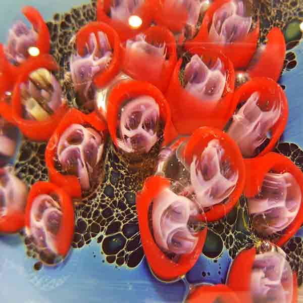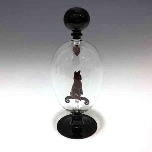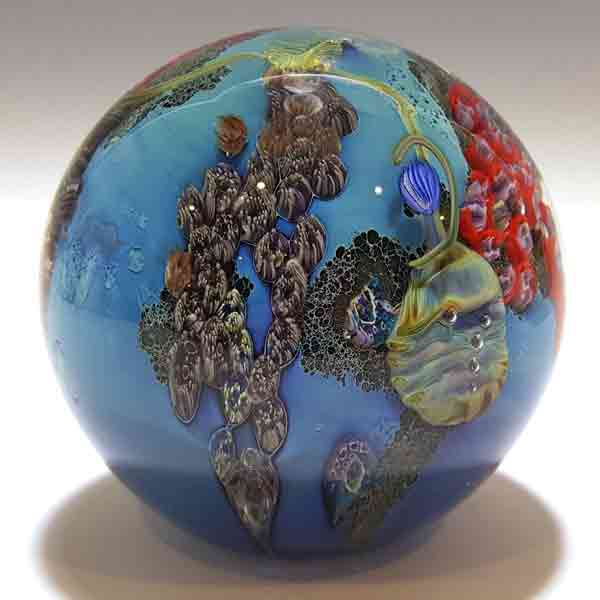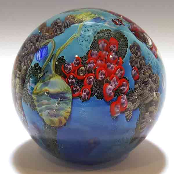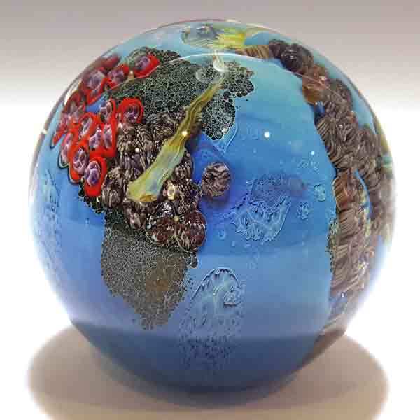 While he has been successful creating unique goblets, vases and bowls, perhaps his greatest satisfaction is derived from his planets: luminous glass spheres encasing kaleidoscopic landscapes, underwater scenes and vistas of outer space that reflect the Earth and the vastness and complexity of the universe.
