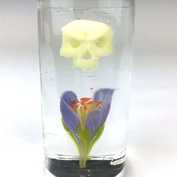 Momento Mori Flower Column – Paul Stankard and Rocko Belloso Collaboration. A white skull is suspended over a lavender flower. “Momento Mori” is a latin phrase meaning “Remember that you have to die”. Flameworked borosilcate glass. Measures approximately 2.5″ h x 1.25″ dia.