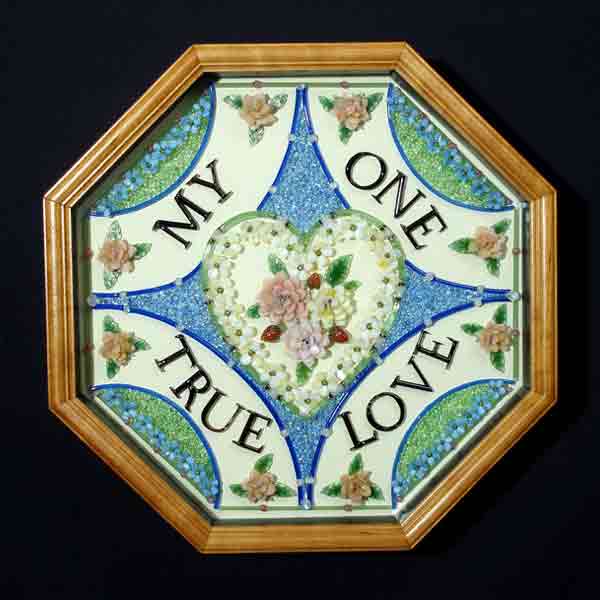 My One True Love Wall piece by Kari Russell-Pool. Flameworked Glass in wood frame. Ready to hang on a wall. 2006. Measures approximately 14.5″ h x 14.5″ w x 3″ d.