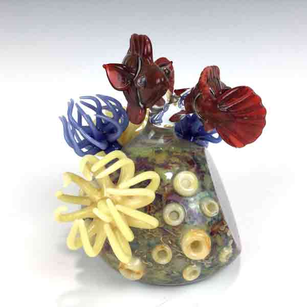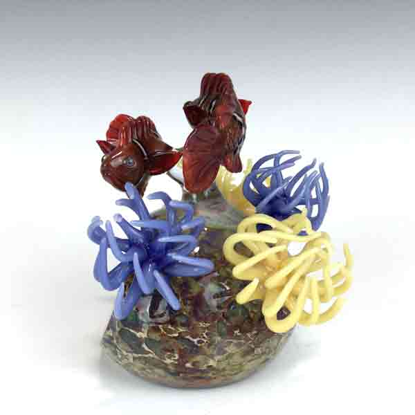 Pair of Clowns Small Sculpture by Milon Townsend. This flameworked glass sculpture features two red Clown Fish swimming near yellow and blue sea anemones. It is signed and dated 2000.
