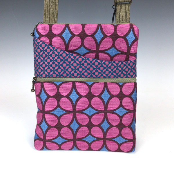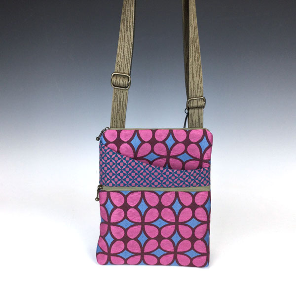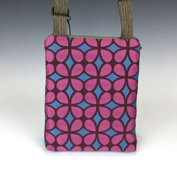 Pocket Bag in Mod Fuschia by Maruca Design. Adjustable 1” web strap. Interior has an additional small pocket. Top zipped main compartment. Exterior has an open front pocket for quick access. 9.5″h x 7″l x 1.5″w, Adjustable Strap Length: 26″ – 49″