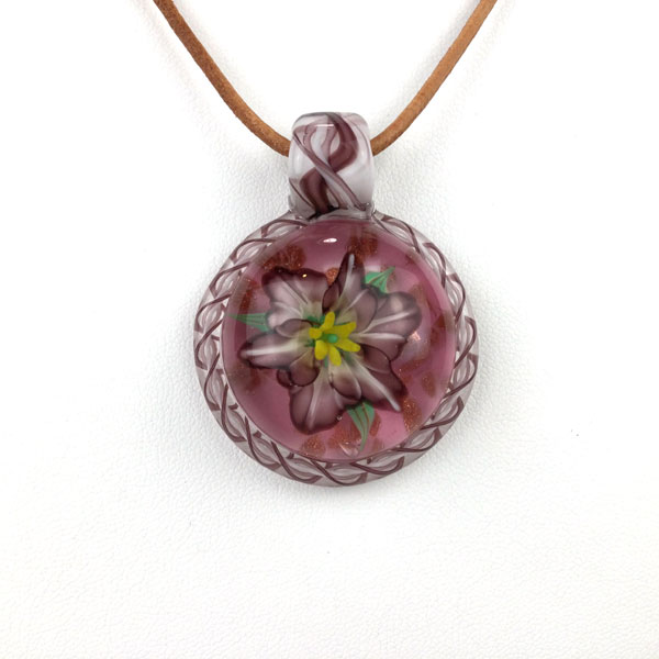 Purple Flower Pendant by Dennis Gerasimov. Flameworked glass pendant with 16″ cord. A delicate flower pendant encircled in a glass cane. Artist signature cane is on the back of the pendant. This pendandt is UV Reactive. It glows under a blacklight.